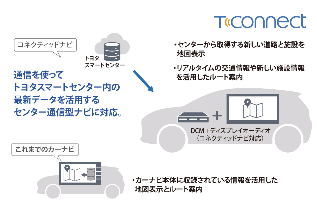 *1. コネクティッドナビのご利用には、T-Connectスタンダード(22)の契約と、ディスプレイオーディオ(コネクティッドナビ対応)Plusはコネクティッドナビ(車載ナビ有)の契約、ディスプレイオーディオ(コネクティッドナビ対応)はコネクティッドナビの契約が必要となります。初度登録日から5年間無料(6年目以降有料)となります。 *2. コネクティッドナビは、専用通信機(DCM)が正常に通信できる環境の場合にご利用いただけます。