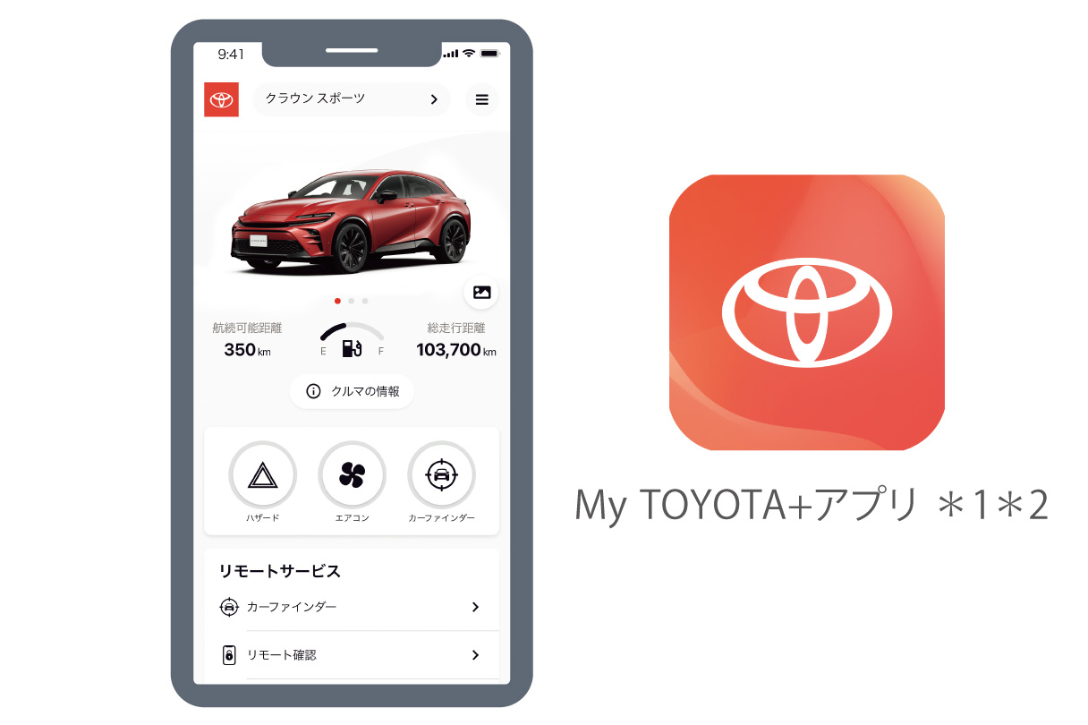 *1. スマートフォンアプリ「My TOYOTA+」のインストールが必要です。 *2. ご利用には、T-Connectスタンダード(22)の契約と「TOYOTAアカウント」の取得が必要となります。また初度登録日から5年間無料(6年目以降有料)となります。