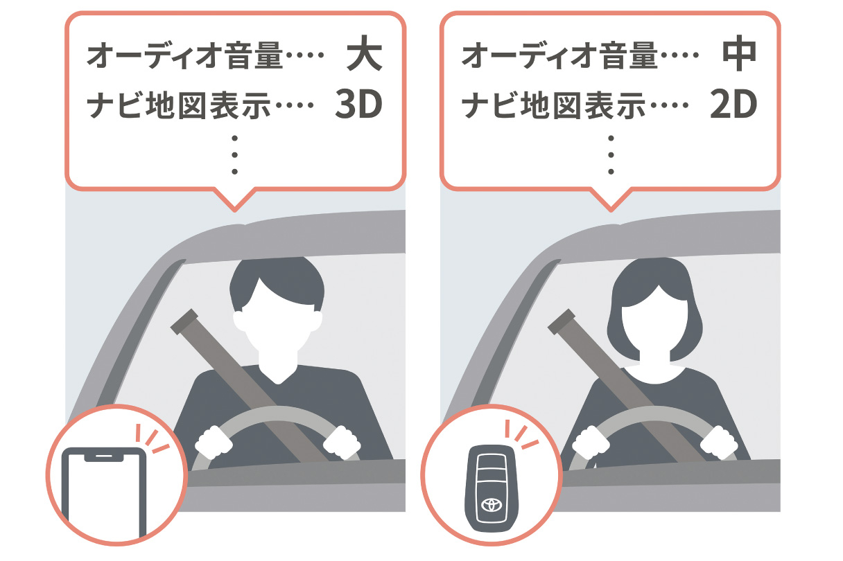 ご家族でクルマをシェアする時など、個々のよく使うオーディオやナビの地図表示など運転する方のお好みの車両設定を記録。乗車の際、事前に登録したスマートキーやスマートフォン*2で運転者を認識し、ドライバーそれぞれの最適な車内環境に自動で設定します。