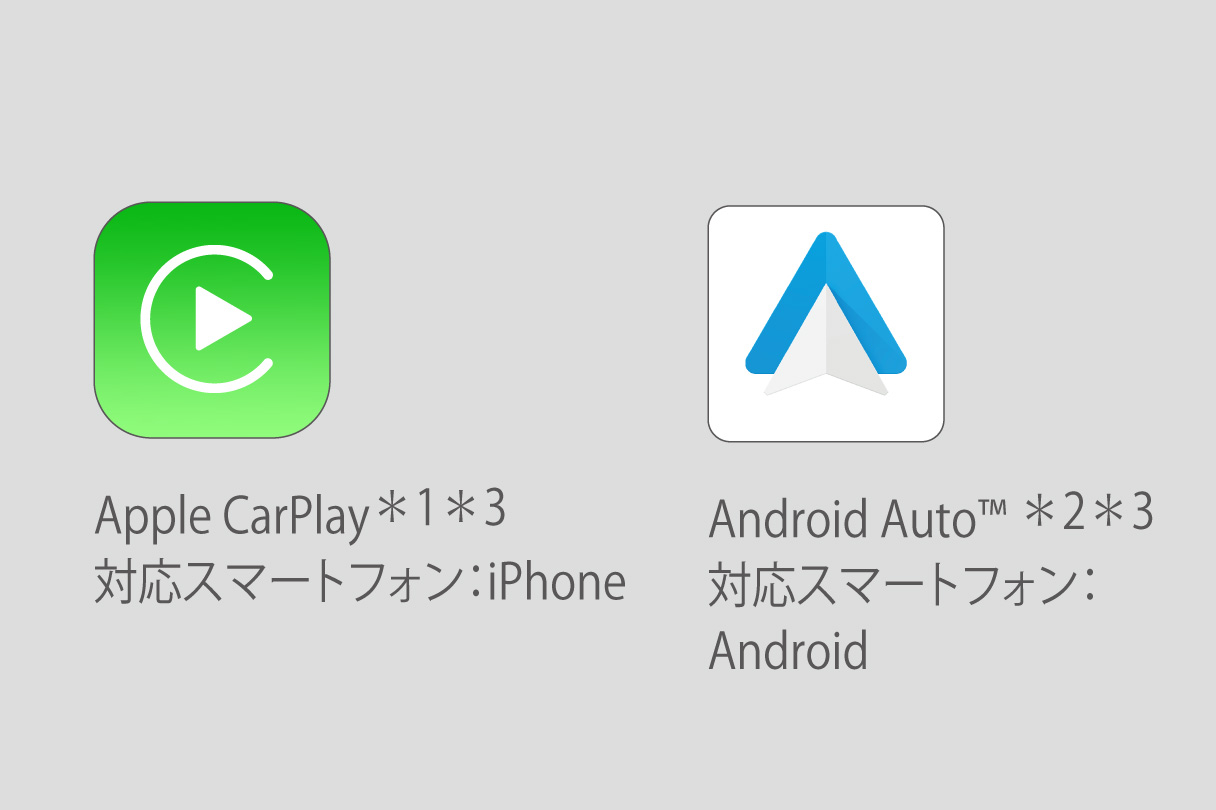 *1. Apple CarPlayをサポートする機種および対応アプリ、接続設定につきましては、(https://www.apple.com/jp/ios/carplay/)でご確認ください。本機での動作を保証しているわけではありません。 *2. スマートフォンの接続には、データ通信可能なUSBケーブルが別途必要となります。また、一部ケーブルには対応できないものがあります。 *3. Android AutoTMをサポートする機種および対応アプリ、接続設定につきましては、(https://www.android.com/auto/)でご確認ください。本機での動作を保証しているわけではありません。 *4. Apple CarPlayのワイヤレス接続と車内Wi-Fiとは併用できません。車内Wi-Fiをお使いの場合は、Apple CarPlayをケーブル接続にてご利用ください。