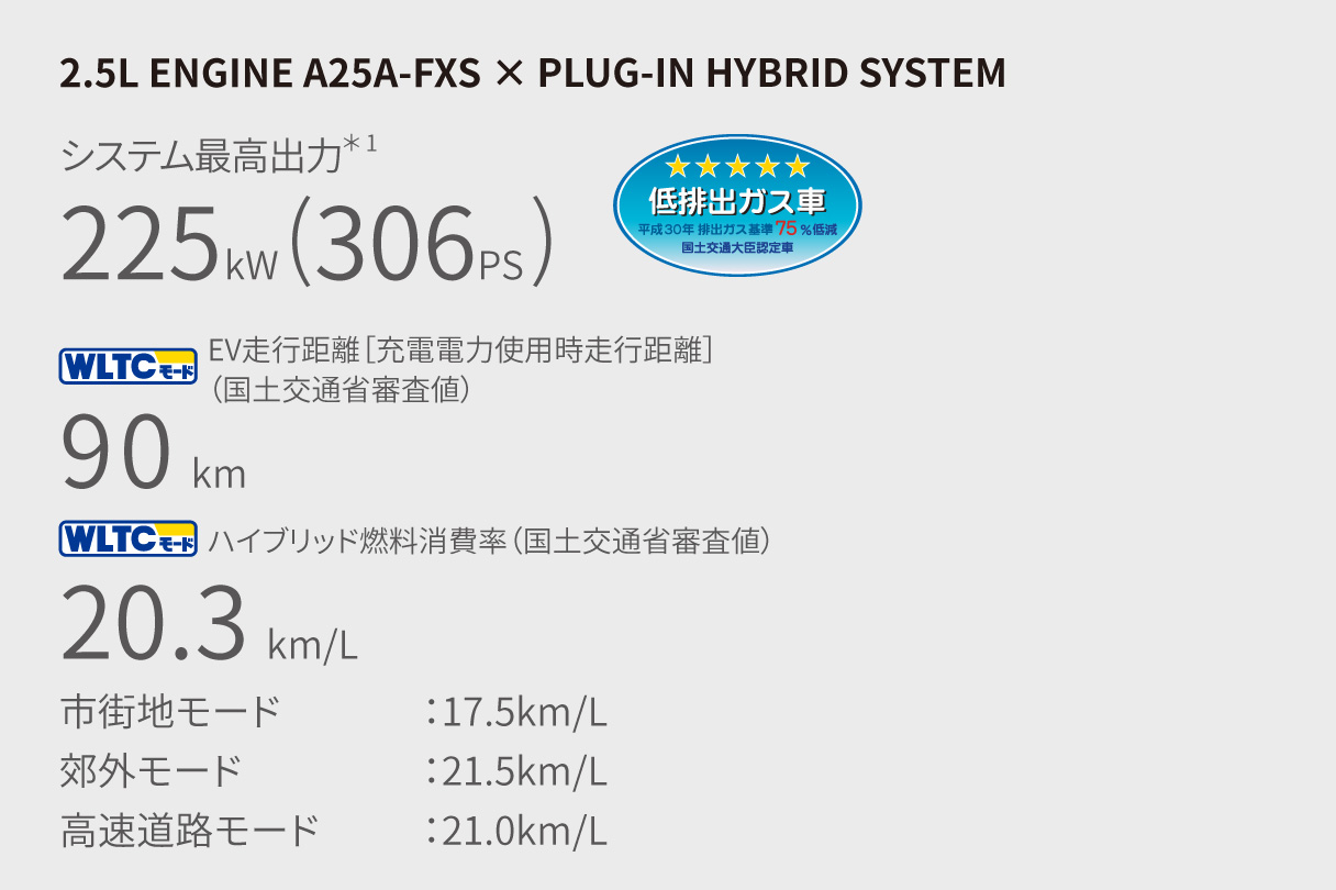 ■充電電力使用時走行距離は定められた試験条件のもとでの値です。お客様の使用環境(気象、渋滞等)や運転方法(急発進、エアコン使用等)に応じてEV走行距離は大きく異なります。 ■エンジン、駆動用電池の状態、エアコンの使用状況や運転方法(所定の車速を超える)などによっては、バッテリー残量に関わらずEV走行が解除され、エンジンが作動します。 ■燃料消費率は定められた試験条件のもとでの値です。お客様の使用環境(気象、渋滞等)や運転方法(急発進、エアコン使用等)に応じて燃料消費率は異なります。 ■WLTCモードは、市街地、郊外、高速道路の各走行モードを平均的な使用時間配分で構成した国際的な走行モードです。市街地モードは、信号や渋滞等の影響を受ける比較的低速な走行を想定し、郊外モードは、信号や渋滞等の影響をあまり受けない走行を想定、高速道路モードは、高速道路等での走行を想定しています。 *1. エンジンとモーターにより、動力性能として発揮できる出力。トヨタ自動車(株)算定値。 ■EV:電気自動車 PHEV:プラグインハイブリッド車 HV:ハイブリッド車