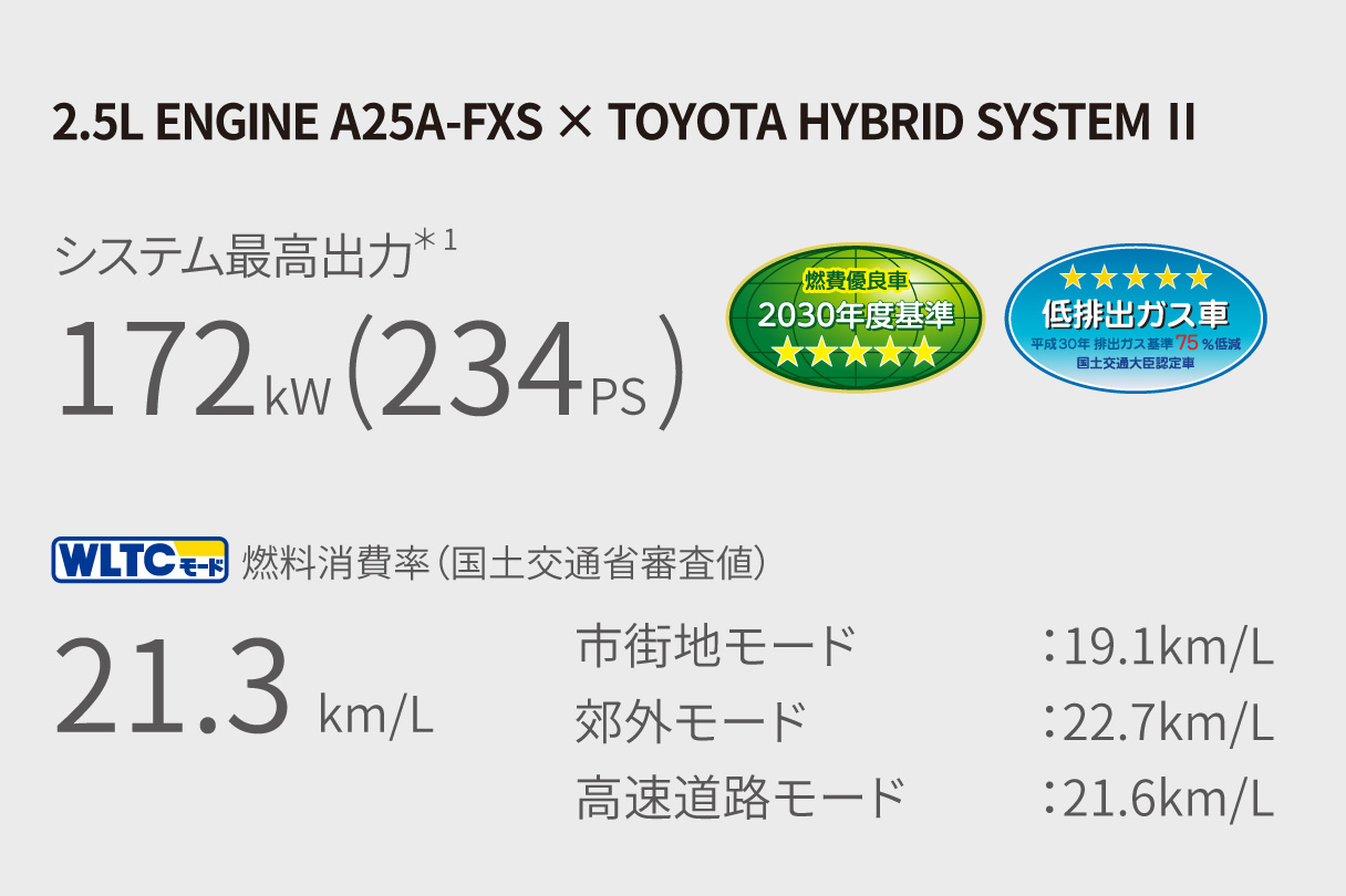 ■燃料消費率は定められた試験条件のもとでの値です。お客様の使用環境(気象、渋滞等)や運転方法(急発進、エアコン使用等)に応じて燃料消費率は異なります。 ■WLTCモードは、市街地、郊外、高速道路の各走行モードを平均的な使用時間配分で構成した国際的な走行モードです。市街地モードは、信号や渋滞等の影響を受ける比較的低速な走行を想定し、郊外モードは、信号や渋滞等の影響をあまり受けない走行を想定、高速道路モードは、高速道路等での走行を想定しています。 *1. エンジンとモーターにより、動力性能として発揮できる出力。トヨタ自動車(株)算定値。