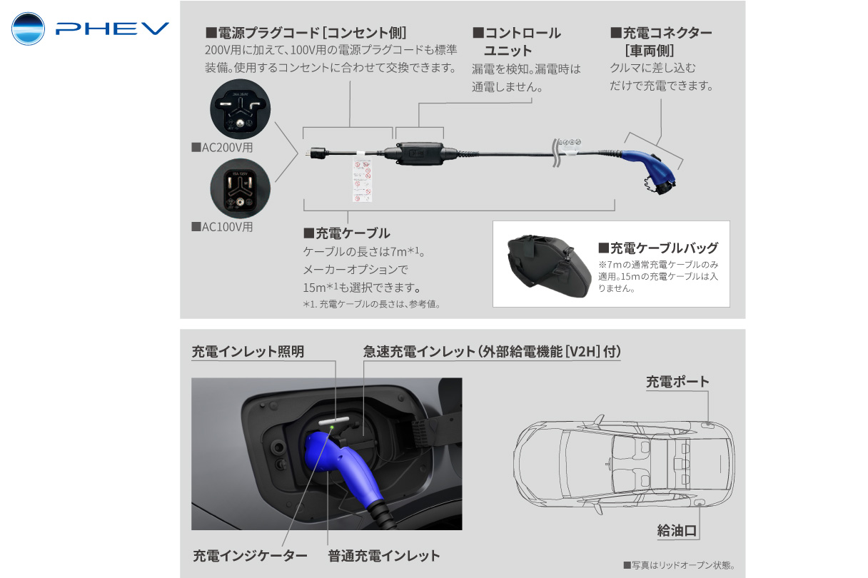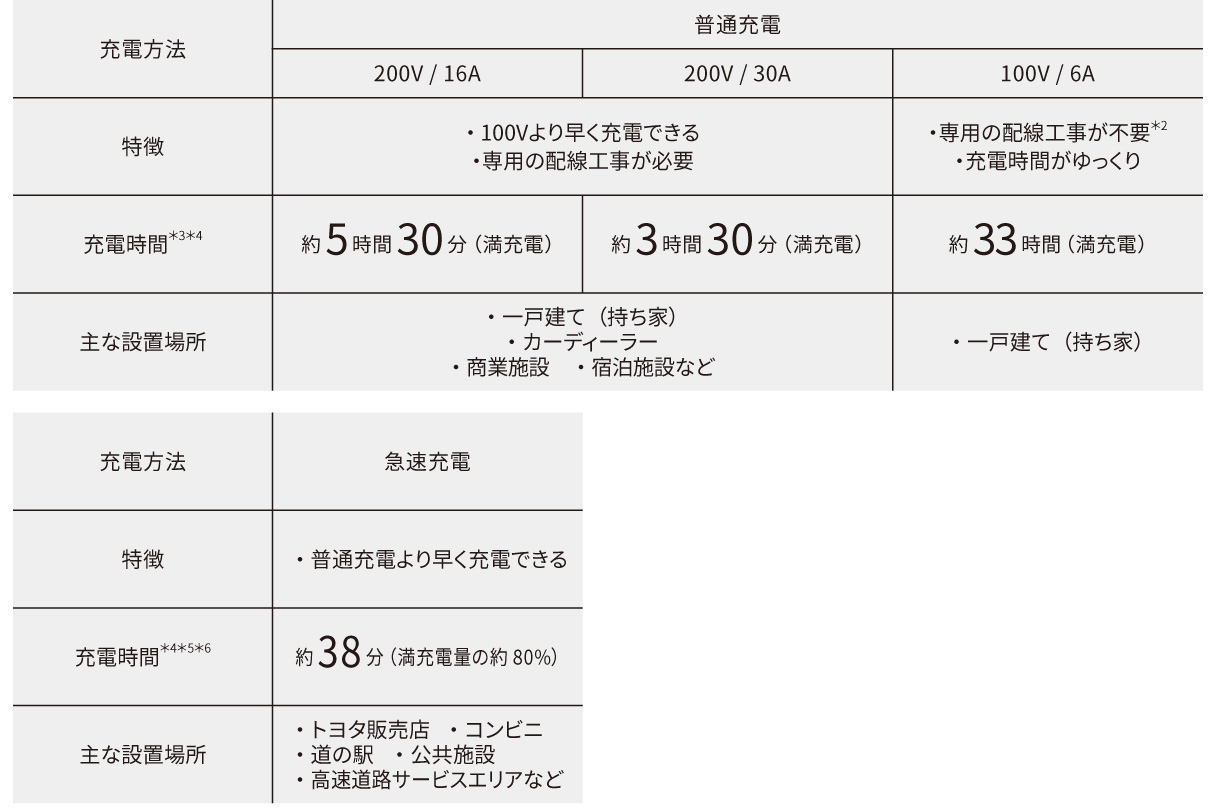 *1. 付属の充電ケーブル以外はご使用になれない場合があります。 ※普通充電時間について:普通充電ケーブルを用いた場合は、約3kW(200V)の充電となります。約6kWで充電を行う場合は、電流上限が30A以上の普通充電器(スタンド)が必要になります。 *2. 抜止形コンセントの場合は、軽負荷電動車両充電用コンセントへ交換が必要となります。 *3. EVモードからHVモードに切り替わった状態から満充電までのおおよその目安です。駆動用電池の残量や温度・外気温・接続した電源の状態・普通充電器(スタンド)の仕様などにより変わります。 *4. トヨタ自動車(株)測定値。 *5. EVモードからHVモードに切り替わった状態から、満充電の約80%までのおおよその目安です。駆動用電池の残量や温度・外気温・接続した電源の状態・急速充電器(スタンド)の仕様などにより変わります。 *6. 50kW(最大125A)以上の急速充電器(スタンド)を使用した場合の充電時間。