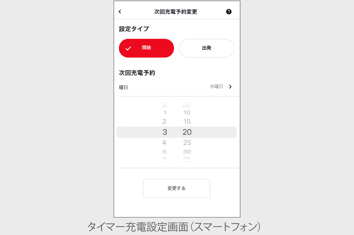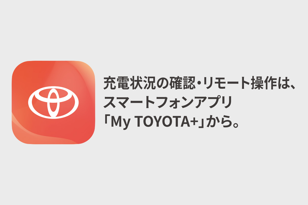 普通充電の開始または出発時刻をあらかじめ設定できる機能です。ディスプレイオーディオ画面やマルチインフォメーションディスプレイから充電の予約が可能。また、スマートフォンアプリ「My TOYOTA+」では、次回予約の変更や、遠隔操作で充電を行うことができます。