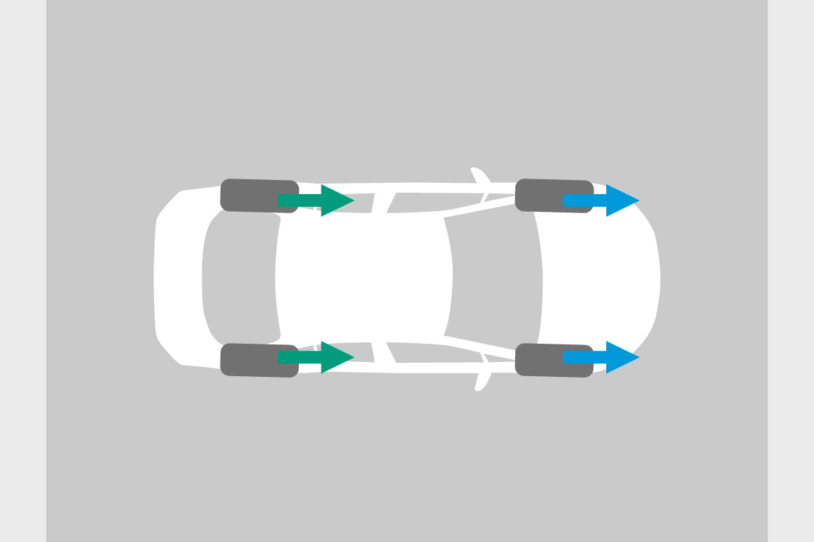 加速時や雪路などの滑りやすい路面で、スムーズに4WD状態へ切り替えることで、発進性、走行安定性を賢くアシストするE-Four。走行状態に合わせて前後輪トルク配分を100:0~20:80の間で緻密に制御します。効率的なトルク配分(直進時)に加え、コーナリングではリヤの駆動力配分を大きくし、低燃費への貢献と旋回中の車両安定性向上を両立しました。