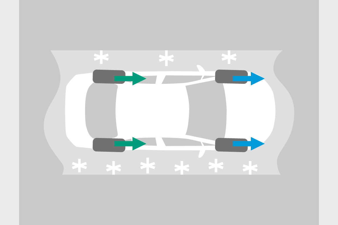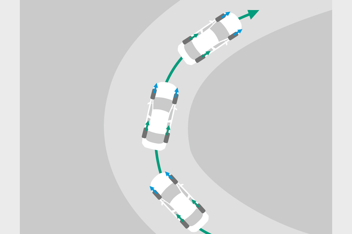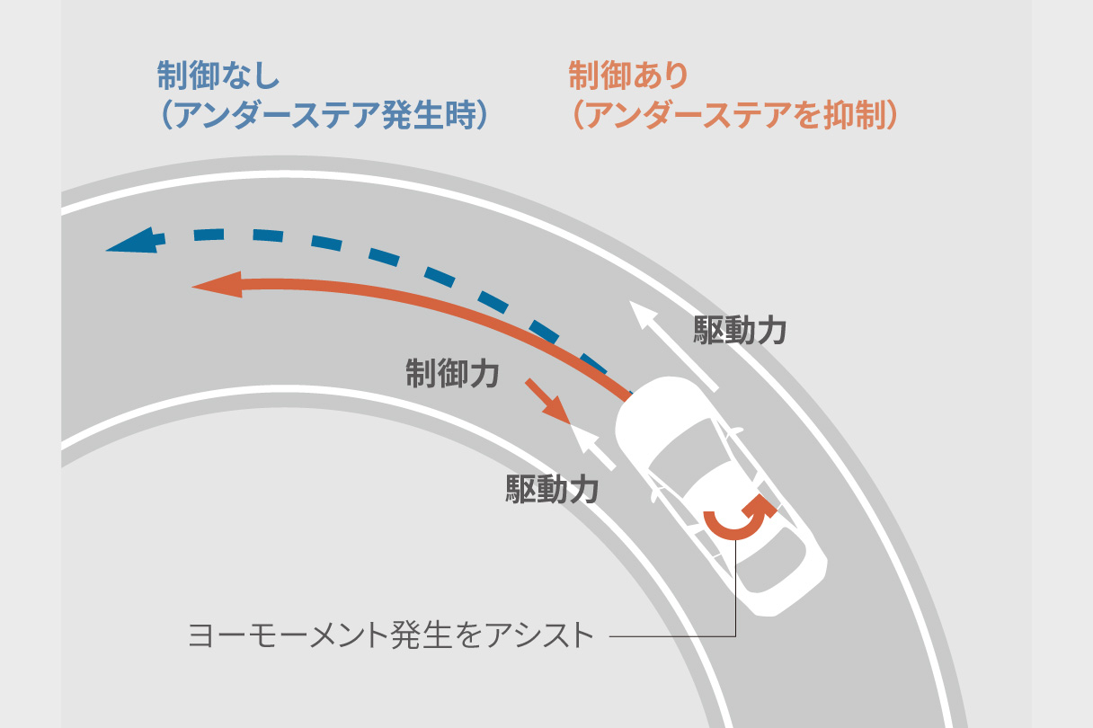 ワインディング走行等のシチュエーションにおいて、ブレーキ制御により内輪の駆動力を調整し、コーナリングをアシストします。