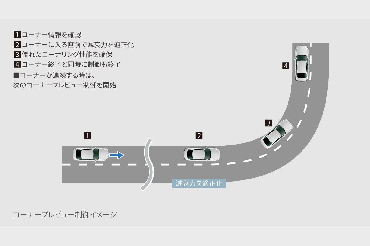 状況に応じて減衰力を制御するサスペンションシステム「AVS」と、ナビゲーションシステムを融合。ナビゲーションコンピューターより受信した車両前方のコーナー情報をもとに、あらかじめショックアブソーバーの減衰力を最適に制御し、コーナリング時の安定感をもたらします。