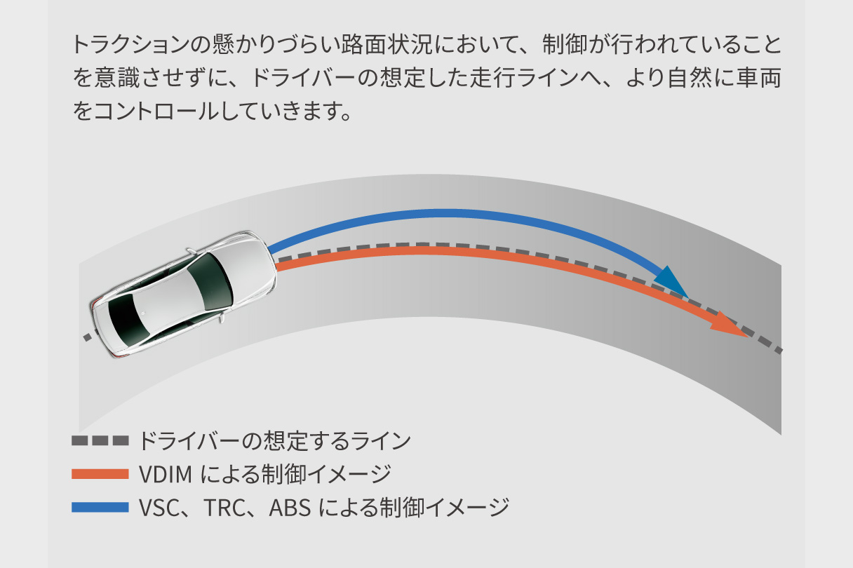 エンジン、ブレーキ、ステアリングなどの機能をひとつのシステムとして統合制御することで、高い予防安全性と理想的な運動性能を両立させる、先進の車両運動制御システムです。従来のEBD付ABS、VSC、TRC、EPSがそれぞれ限界付近で制御を開始するのに対して、VDIMはより早く、限界領域にいたる前に制御を開始して、クルマの挙動をよりスムーズにコントロールします。
