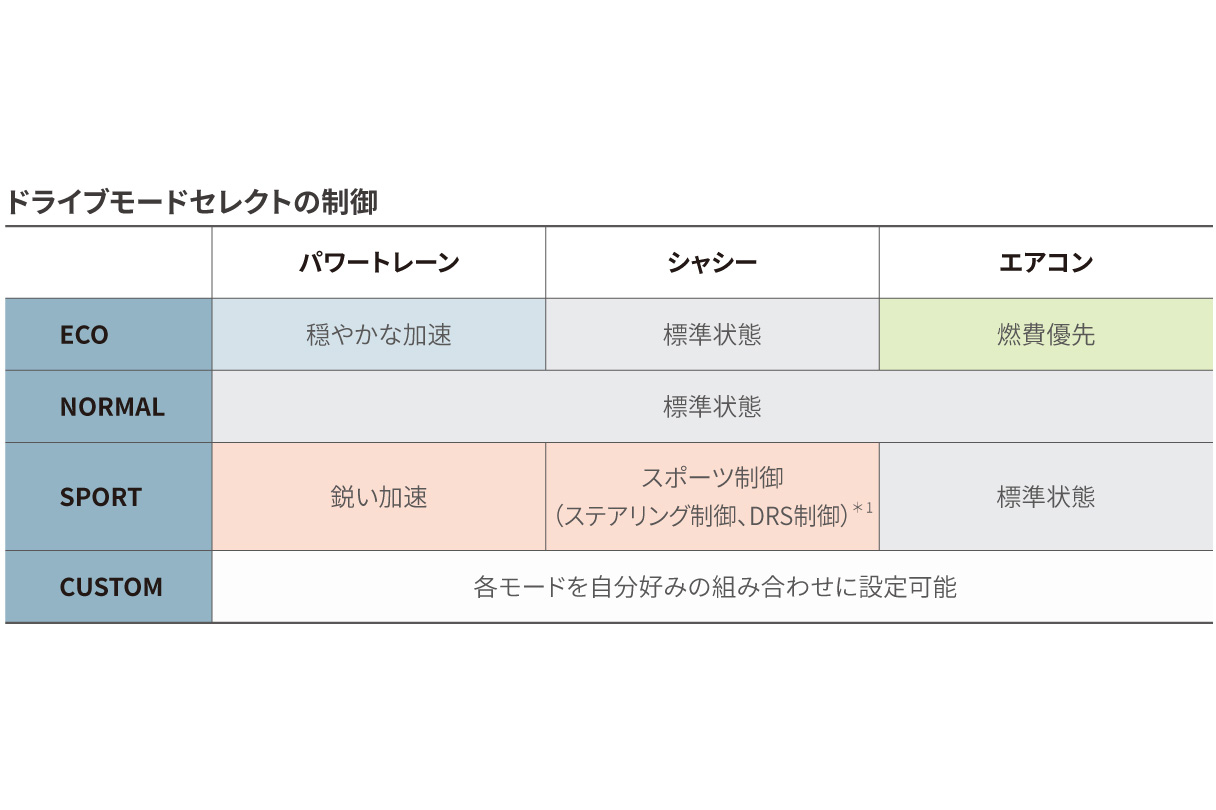 ■ECOモード以外のモードを選択して走行後、ハイブリッドシステムを停止すると、自動的にNORMALモードに切り替わります。 *1. プラグインハイブリッド車のSPORTモード(シャシー)では、AVS制御も加わります。