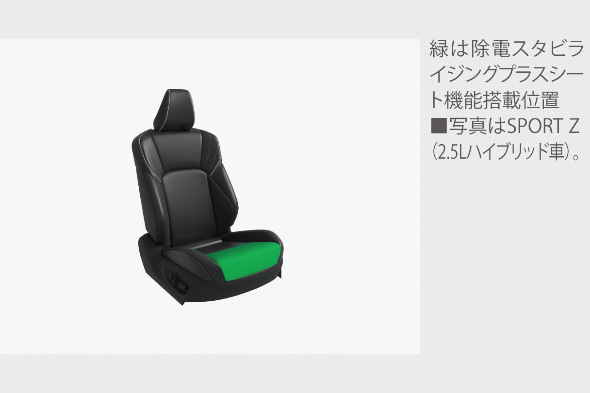 運転席の一部に除電機能付表皮を設定し、タイヤ周りの帯電を低減することで、安定した車両挙動に貢献し、より疲れにくく気持ちのいいドライビングに寄与します。