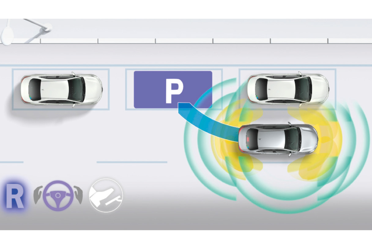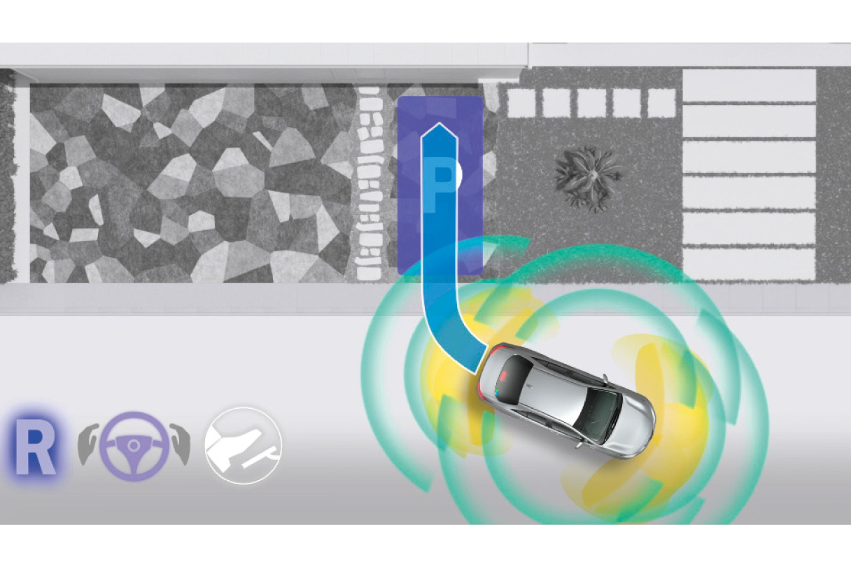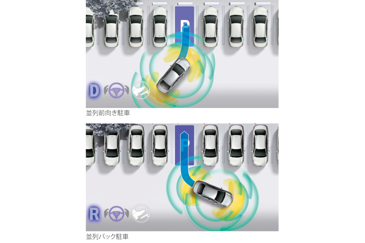 スイッチを押すだけで駐車操作を支援してくれるアドバンスト パーク。並列駐車においては、バック駐車、前向き駐車、バック出庫、前向き出庫が可能です。ステアリング、アクセル、ブレーキ、シフトの全操作をクルマが支援してくれるため、安心してラクに停められます。また、カメラやソナーによって、周囲を監視しながら駐車を支援。障害物を検知した場合には警報を鳴らし、ブレーキ制御を行うことで接触回避を支援します。
