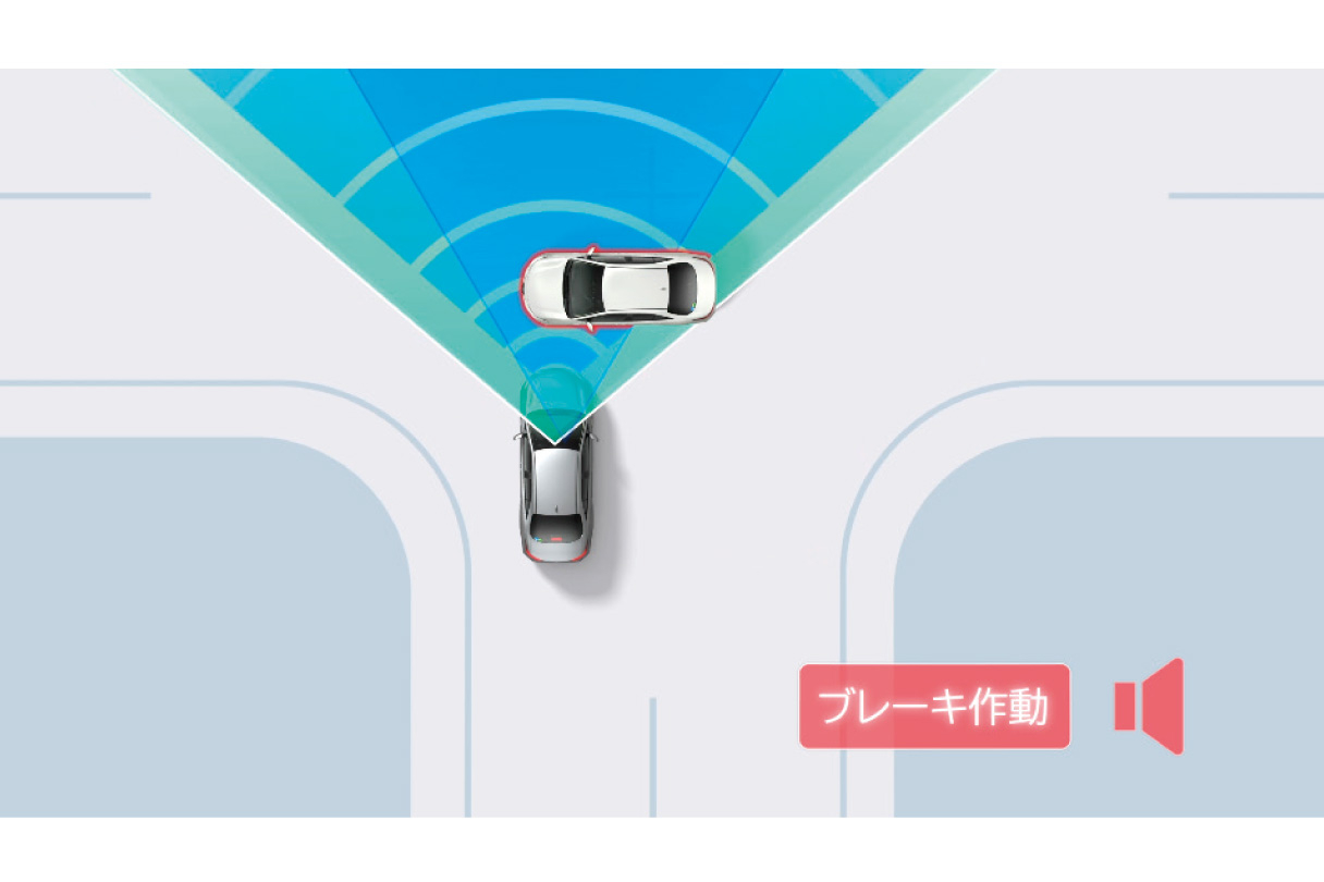 交差点に進入する際、交差する車両や自動二輪車をミリ波レーダーと単眼カメラで検出。ブザーと表示で衝突の可能性を知らせると同時に、プリクラッシュブレーキを作動。衝突回避または被害軽減をサポートします。