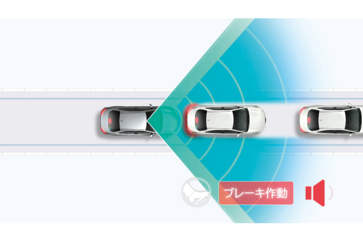 前方の車両や歩行者(昼夜)、自転車運転者(昼夜)、自動二輪車(昼)をミリ波レーダーと単眼カメラで検出。警報ブザーとマルチインフォメーションディスプレイ表示で衝突の可能性を知らせ、ブレーキを踏めた場合はプリクラッシュブレーキアシスト。ブレーキを踏めなかった場合はプリクラッシュブレーキを作動させ、衝突回避または被害軽減をサポートします。プリクラッシュブレーキは歩行者や自転車運転者に対しては自車が約5〜80km/hの速度域で作動し、衝突回避または被害軽減をサポートします。また、車両や自動二輪車に対しては自車が約5km/h以上で作動し、衝突回避または被害軽減をサポートします。