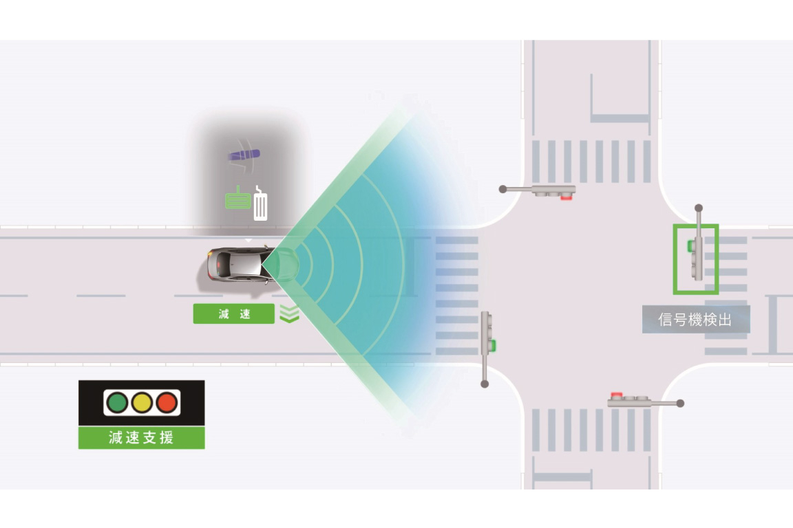 信号交差点への接近を検出した時、ドライバーのアクセルOFF、ウインカー操作に応じてあらかじめ減速を支援し、右左折時の操作余裕を確保します。