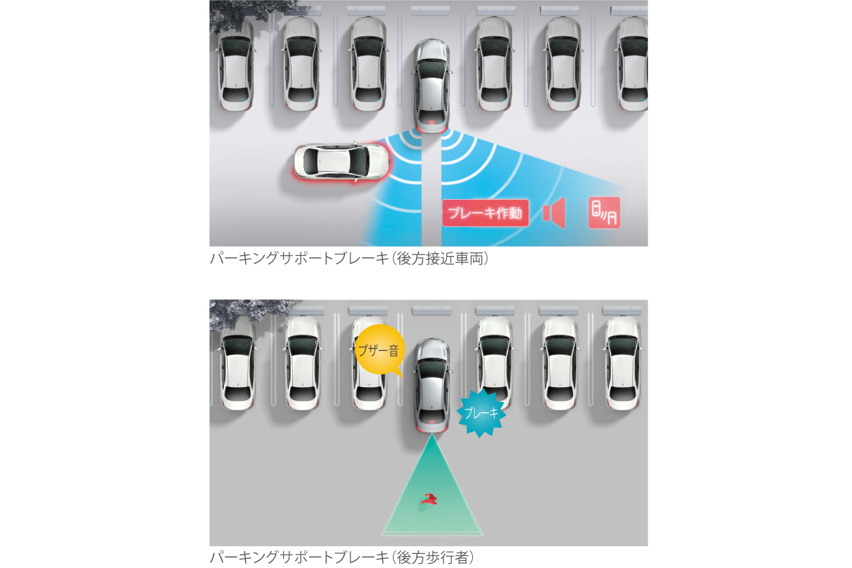 ■パーキングサポートブレーキは衝突被害軽減ブレーキまで働くシステムではありますが、必ず止まることを約束するものではありません。道路状況、車両状態および天候状態等によっては作動しない場合があります。また、衝突の可能性がなくてもシステムが作動する場合もあります。詳しくは取扱説明書をご覧ください。 ■安全運転を行う責任は運転者にあります。常に周囲の状況を把握し、安全運転を心がけてください。 ■ソナーおよびレーダー、カメラの検知範囲、作動速度には限界があります。必ず車両周辺の安全を確認しながら運転してください。 ■運転者自身でパーキングサポートブレーキの衝突被害軽減ブレーキ制御を試すことはおやめください。 ■パーキングサポートブレーキの衝突被害軽減ブレーキが作動した場合でもブレーキ制御は2秒で解除されるため、そのまま前進・後退できます。また、ブレーキペダルを踏んでもブレーキ制御は解除されるため、再度アクセルペダルを踏むことで前進・後退できます。 ■パーキングサポートブレーキ(後方歩行者)は、歩行者以外の立体物に対しても作動することがあります。ブレーキ作動後はブレーキを踏んで周囲の確認をお願いします。 ■イラストは作動イメージです。 ■イラストのカメラ・レーダーの検知範囲はイメージです。