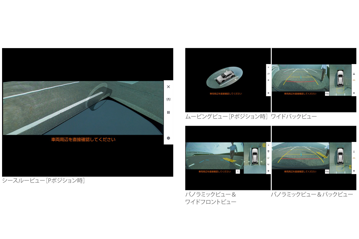 車両を上から見たような映像をディスプレイオーディオ画面に表示。運転席からの目視だけでは見にくい、車両周辺の状況をリアルタイムでしっかり確認できます。さらにクルマを透かして外を見るような映像で周辺を確認できるシースルービューや、車両を後ろ上方から見たような映像を表示し、車両側方の安全確認ができるサイドクリアランスビュー、狭い道での接触回避を確認できるコーナリングビューも採用。パノラミックビューモニター表示中に車両周辺の移動物を検知すると、ブザーと表示により、ドライバーに注意を喚起します。音声操作システムを使えば、メインスイッチを押したり、画面上のスイッチを選択したりする代わりに、声の操作でパノラミックビューを表示させることができます。また、クリアな視界を保つため、バックカメラには洗浄機能が付いています。