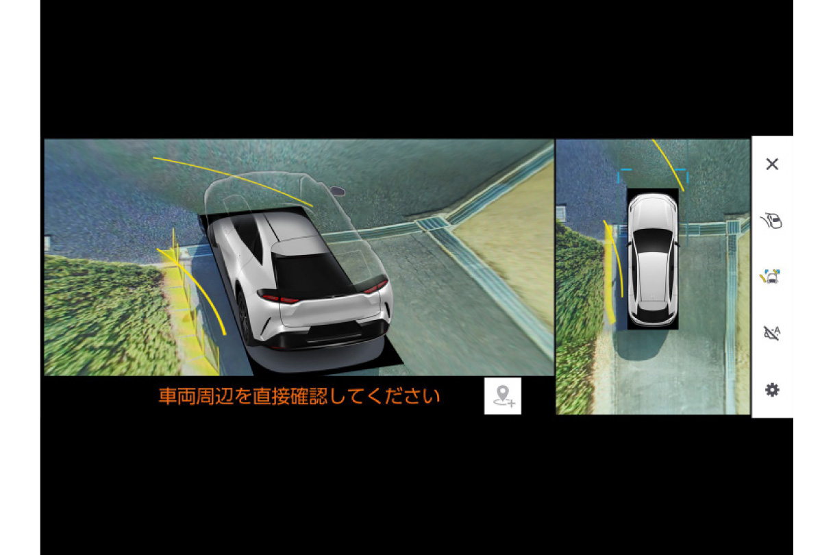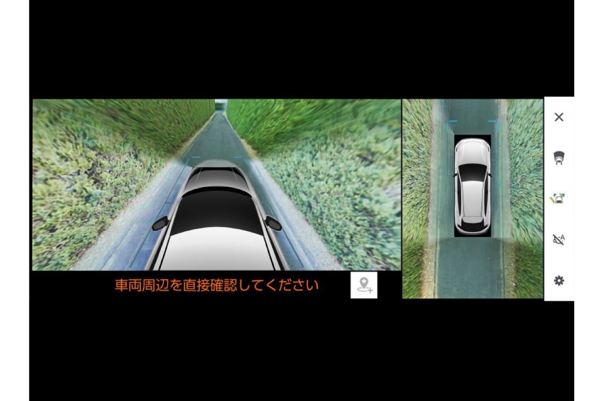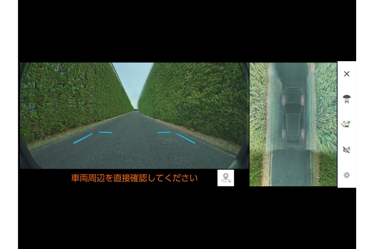 車両前側を後ろから見たような映像を表示。狭い道でのすれ違いや路肩への幅寄せ時に、車両側方の安全確認をサポートします。
