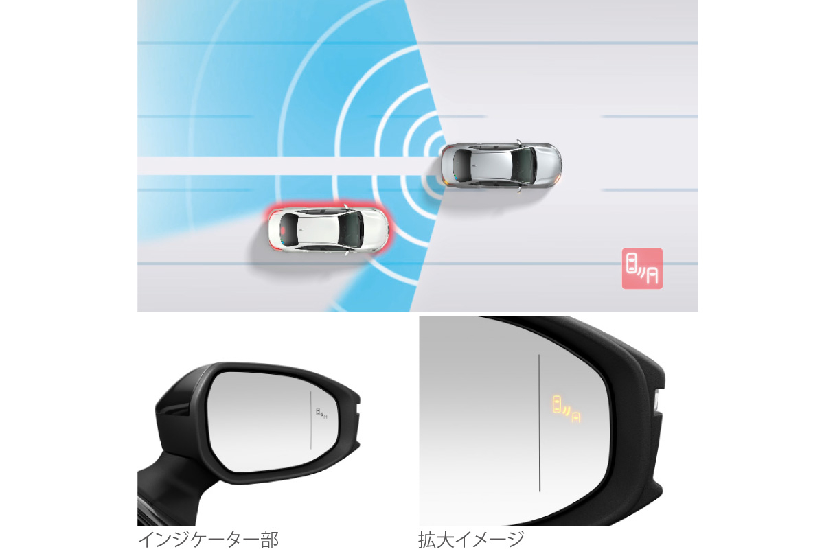 走行中、ドアミラーでは確認しにくい後側方エリアに存在する車両に加えて、隣接する車線の最大約70m後方までモニターし、急接近してくる車両も検知します。車両を検知するとドアミラー内のインジケーターが点灯、車両を検知した状態でウインカーを操作するとインジケーターが点滅するとともにブザーが鳴り、より注意を喚起します。