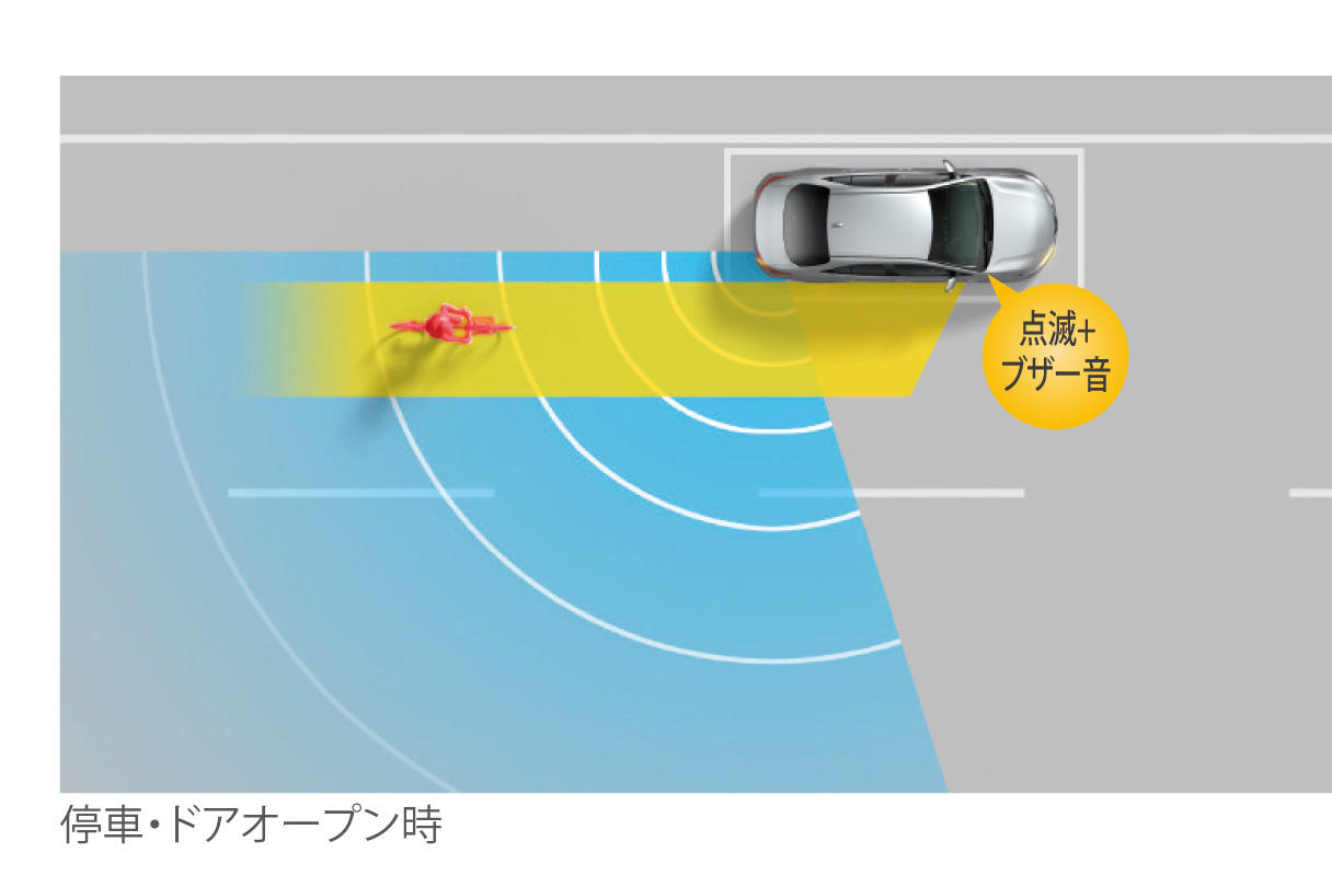 降車時、ブラインドスポットモニター[BSM]のセンサーを活用し、後方からの自転車を含む接近車両などを検知。開放後のドア、もしくは降車した乗員と衝突する可能性があるとシステムが判断した場合、ドアミラー内のインジケーターを点灯させ注意を促します。また、ドアを開けようとした場合は、ブザー、ドアミラー内のインジケーターの点滅、メーターの表示で乗員に告知します。
