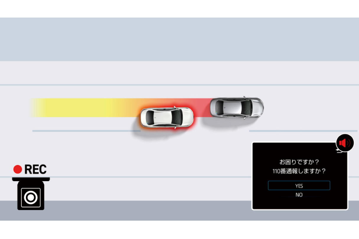 後方車両が非常に接近した場合、マルチインフォメーションディスプレイ表示と音声通知で警察もしくはヘルプネット®*1への接続を提案。接続後、対処方法をお伝えします。また、ドライブレコーダー(前後方)にはイベント記録を実施します。状況を自動録画し、専用領域へ保存するので上書きされにくくなります。