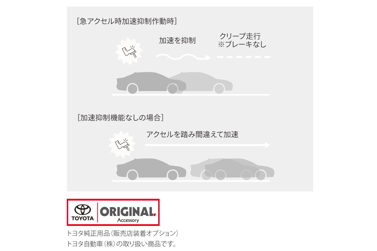 低速時の自車の直前にいる歩行者、自転車運転者、車両をミリ波レーダーと単眼カメラで認識。前方に対象物がある状態で、停車または徐行状態からアクセルペダルが必要以上に強く踏み込まれた場合には、ハイブリッドシステム出力を抑制または弱いブレーキをかけることで加速を抑制し、衝突回避または被害軽減をサポートします。