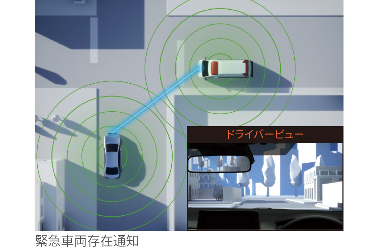 クルマに搭載したセンサーでは捉えきれない見通し外のクルマや人の存在、信号情報を、クルマとクルマ、あるいは道路*2とクルマが直接通信して取得し、マルチインフォメーションディスプレイ表示やブザー音でドライバーに知らせることで安全運転を支援します。