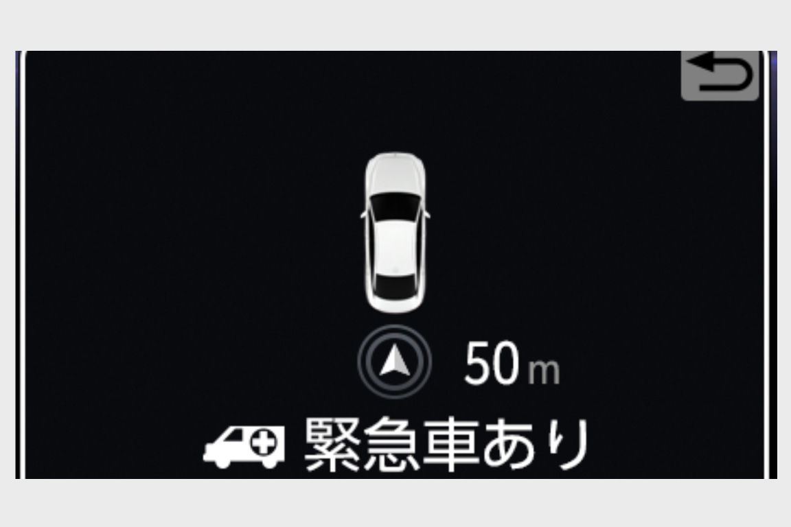 サイレンを鳴らしている緊急車両(救急車)が存在する場合に、ブザー音と音声案内で通知し、自車両に対するおおよその方向・距離・緊急車両の進行方向を表示します。救急車が見えにくい、騒音でサイレンが聞こえにくい等の状況でも、事前に緊急車両の存在を知ることが可能となります。