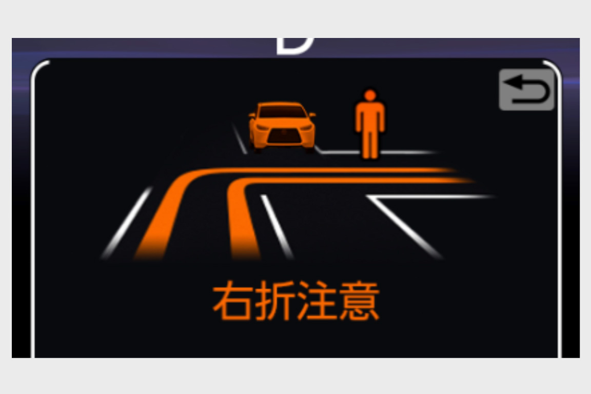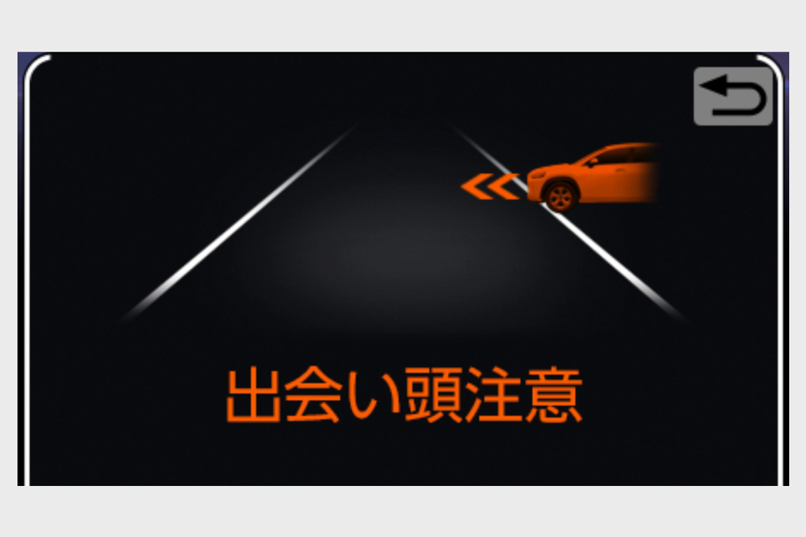交差点に進入する際など、左右から接近する車両を検知。車両が接近しているにもかかわらずドライバーが発進しようとした場合は、ブザーと表示で注意を促します。また、カラーヘッドアップディスプレイに、車両が近づいてくる方向をアニメーションで表示し、ドライバーが気づきやすい注意喚起を行います。