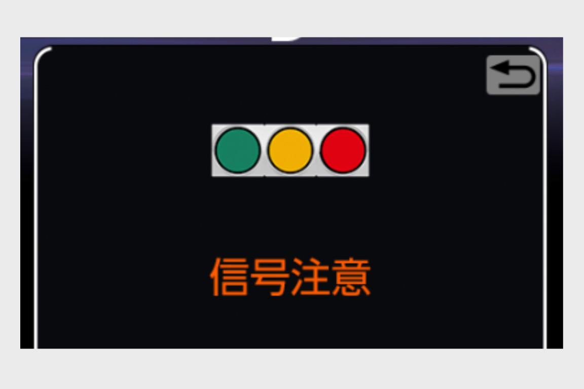 道路側の路側装置より信号(色)情報を取得。赤信号交差点に近づいてもアクセルペダルを踏み続け、ドライバーが赤信号を見落としている可能性がある場合に、表示とブザー音による注意喚起を行い、安全に停止できるよう支援します。