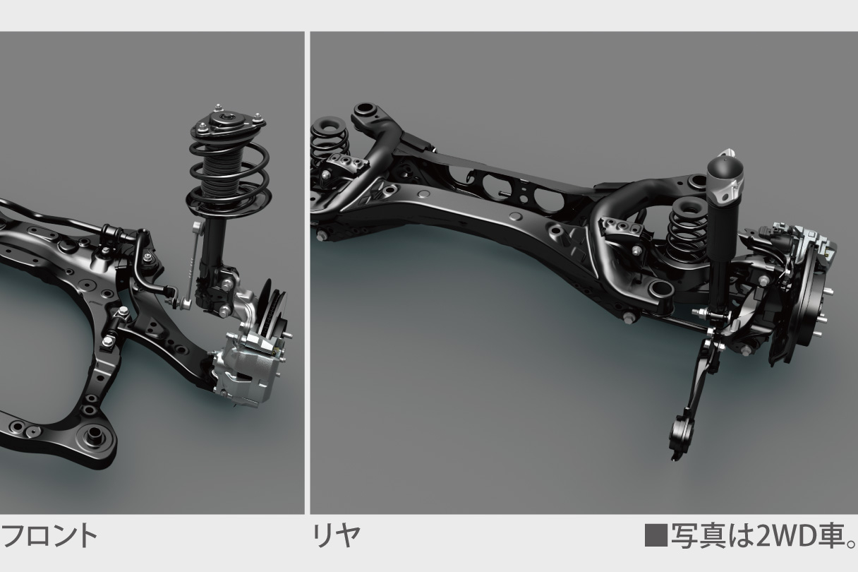 路面のアップダウンや凹凸に対し、フロント/リヤコイルばね、スタビライザーばねの特性を最適化することで、クルマの上下挙動をより自然に制御しています。