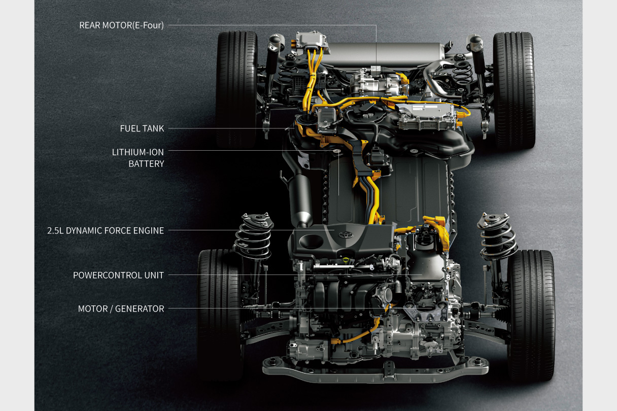 高い燃焼効率・高出力を両立した「2.5Lダイナミックフォースエンジン」と、進化を続けるハイブリッドシステムの小型・軽量・高効率化技術を組み合わせることで、優れた動力性能と低燃費を実現しています。