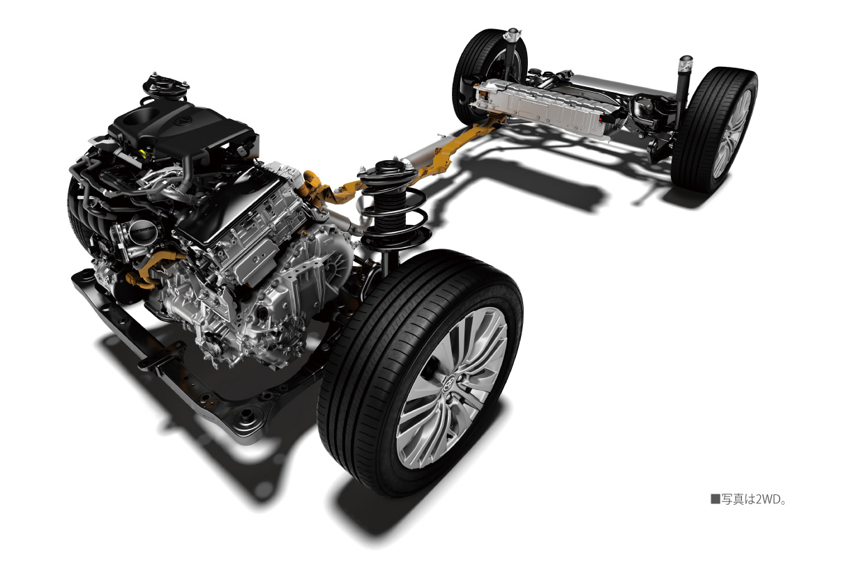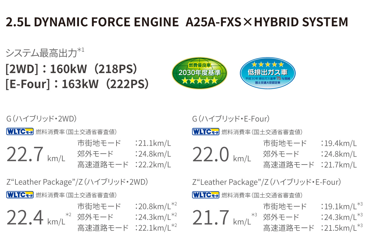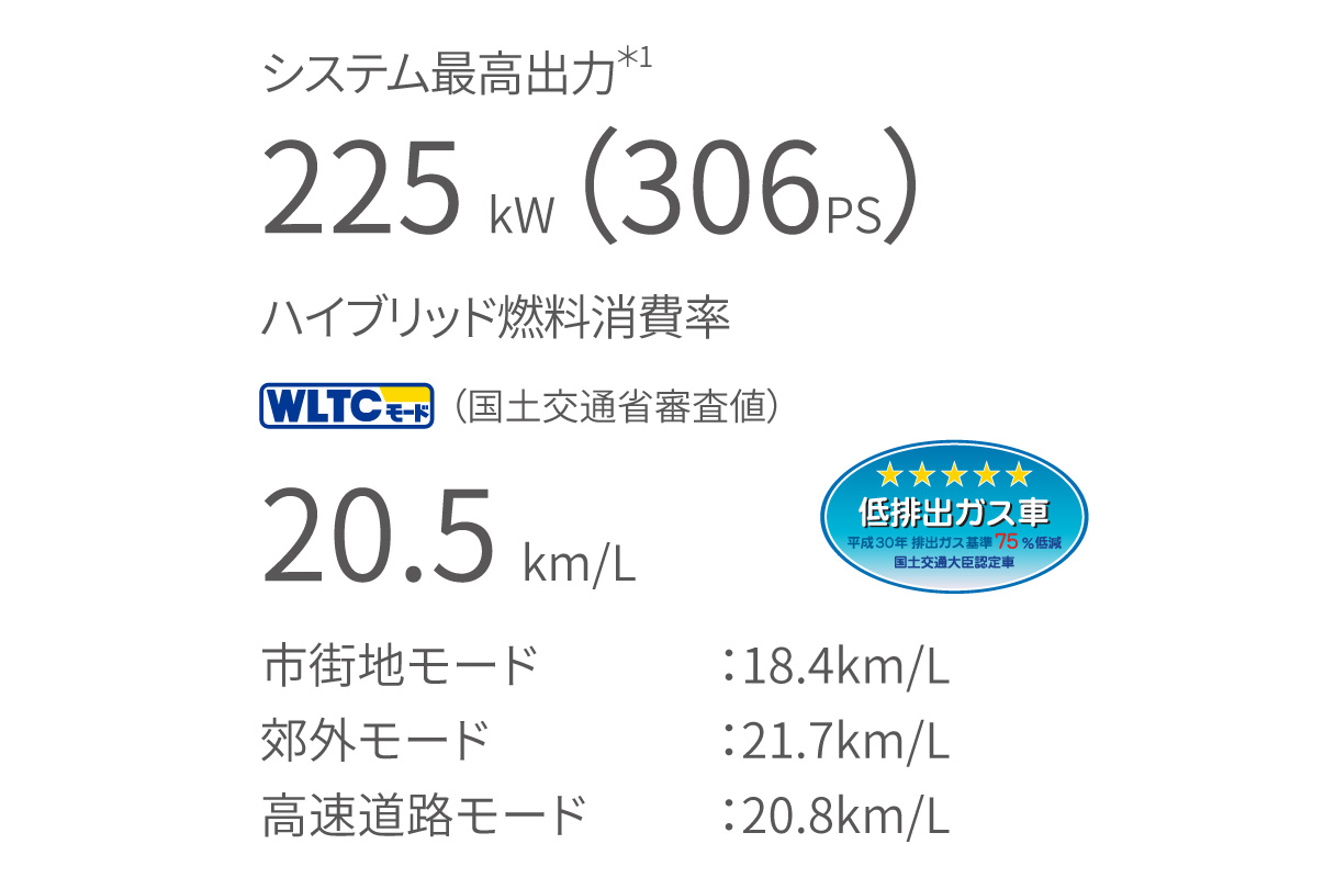 *1. エンジンとモーターにより、動力性能として発揮できる出力。社内算定値。 *2. 調光パノラマルーフを装着した場合、各モード燃費はWLTC:22.3km/L、市街地:20.6km/L、郊外:24.0km/L、高速道路:22.0km/Lとなります。 *3. 調光パノラマルーフを装着した場合、各モード燃費はWLTC:21.6km/L、市街地:18.9km/L、郊外:24.0km/L、高速道路:21.4km/Lとなります。