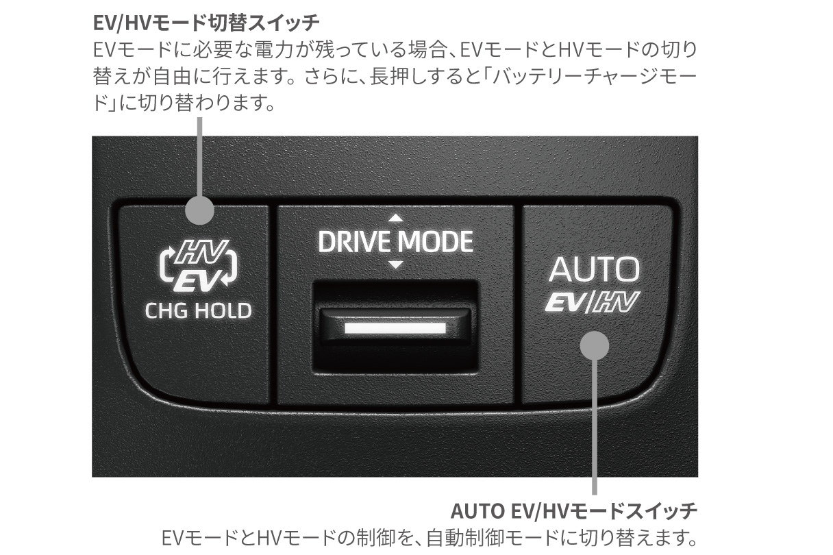 EV走行に必要な駆動用電池残量が低下した際、スイッチ操作により、エンジンで発電した電気をバッテリーに充電。外部充電せずに再びEV走行ができるようになります。