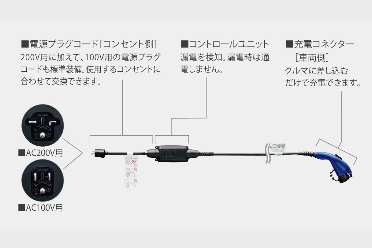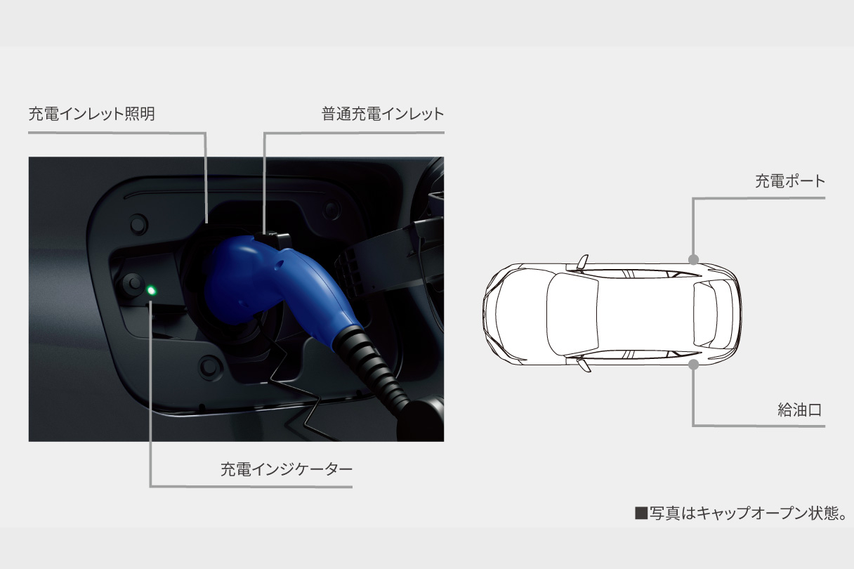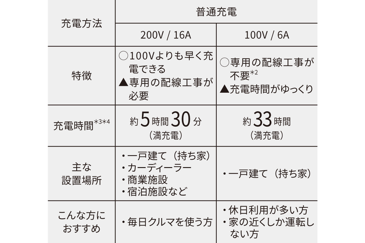 *1. 付属の充電ケーブル以外はご使用になれない場合があります。 *2. 抜止形コンセントの場合は、軽負荷電動車両充電用コンセントへ交換が必要となります。 3. EVモードからHVモードに切り替わった状態から、満充電までのおおよその目安です。駆動用電池の残量や温度・外気温・接続した電源の状態・普通充電器(スタンド)の仕様などにより変わります。 *4. トヨタ自動車(株)測定値。