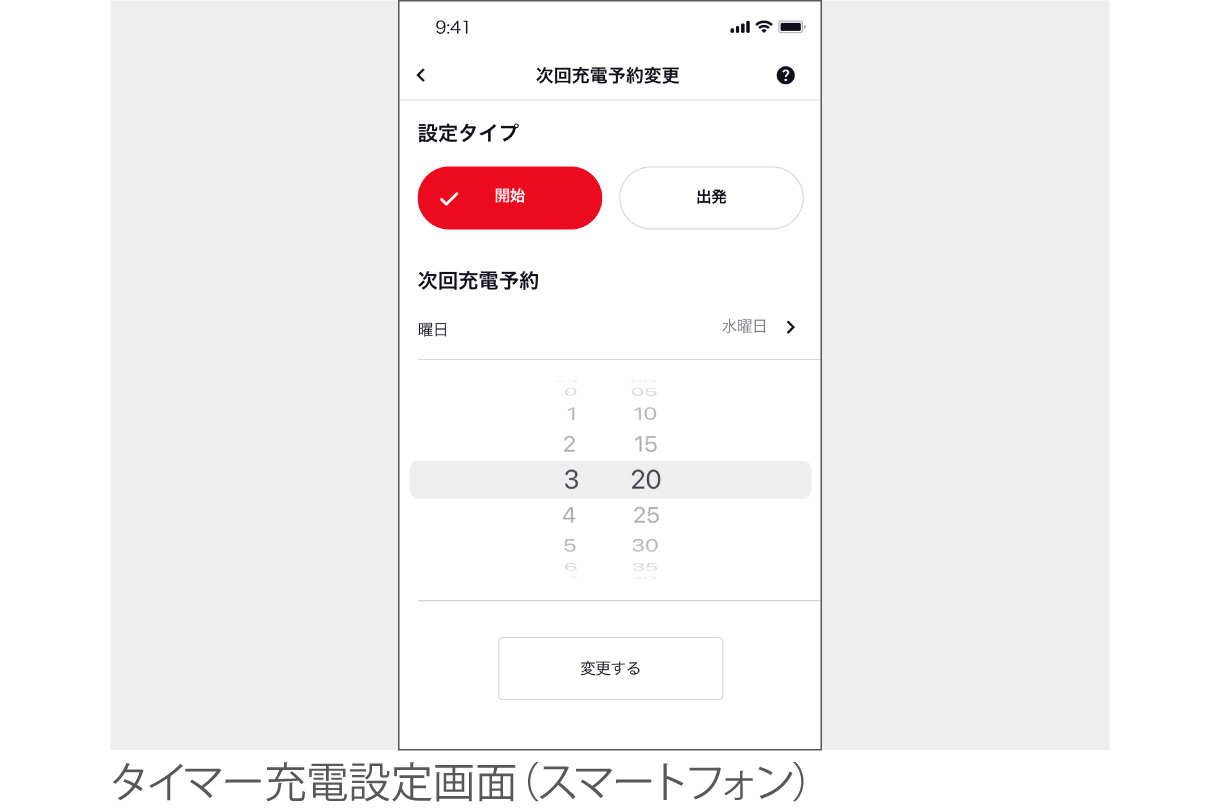 普通充電の開始時刻またはクルマの出発時刻をあらかじめ設定できる機能です。ディスプレイオーディオ画面やマルチインフォメーションディスプレイから充電の予約が可能。また、スマートフォンアプリ「My TOYOTA+」では、次回予約の変更や、遠隔操作で充電を行うことができます。出発時刻に合わせて満充電にするなど、バッテリーに優しい使い方が可能です。