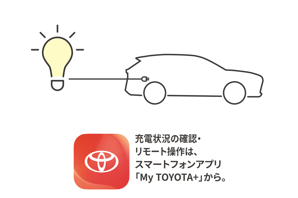 付属の充電ケーブル*1とコンセントをつなぐだけで手軽に充電可能。100V電源なら、専用の配線工事はいりません*2。また外出先でも充電でき、最寄りの充電スポットもスマートフォンアプリ「My TOYOTA+」から簡単に探せます。