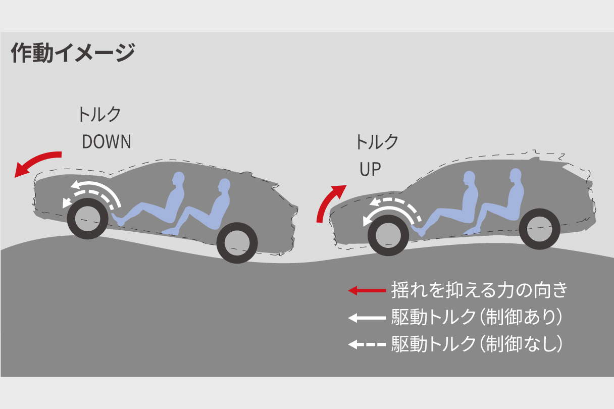 路面の凹凸に応じて、エンジン(ガソリン車)・モーター(ハイブリッド車)のトルクをリアルタイムに制御することで、車体の揺れ(ピッチング)をコントロールし、滑らかでフラットな乗り心地に貢献します。さらにハイブリッド車では、ラフなアクセル操作でのピッチングも抑制し、より滑らかな乗り心地とスムーズな加速感、安定性を実現します。