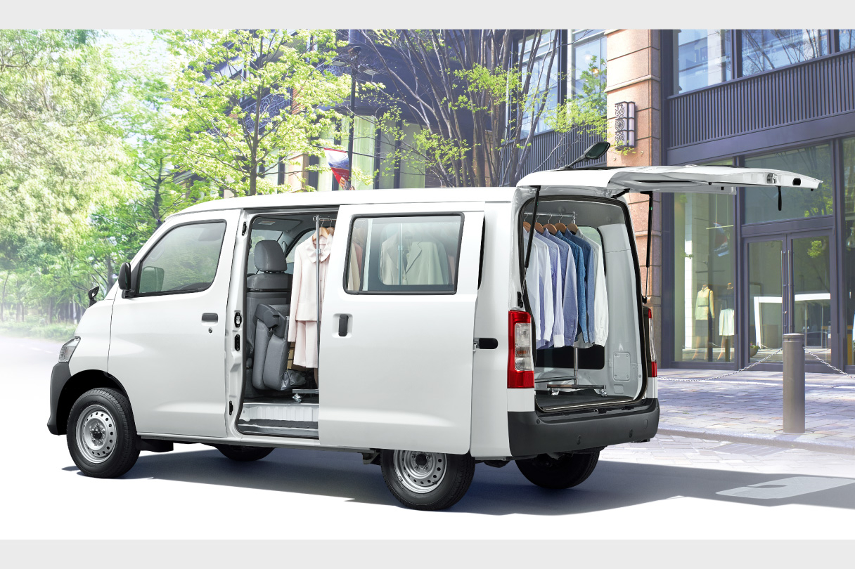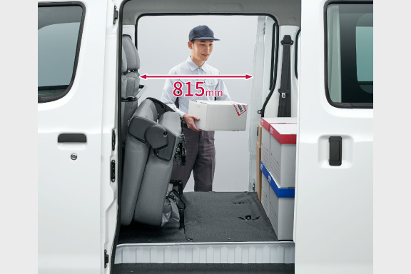 コンパクトなボディ寸法から想像を超える広い室内空間。スクエアなパッケージ設計で、荷室もキャビンもゆとりの広さ。ワイドな開口部の両側スライドドアと、大きく開くバックドアで荷物の積み下ろしも快適です。
