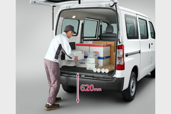 床面地上高わずか620mm。重量物もラクに積み込める低床設計。加えて荷室の高さもしっかり確保されているので、背の高い荷物も余裕で積むことができます。またバックドアのスクエアな開口部により、角張った荷物の積み下ろしもスムーズです。