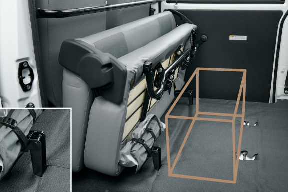 3人掛けのリヤシートは厚めの座面と背もたれで座り心地も良好です。折りたたみ時には、端までしっかり荷物が積めるよう、出っ張りの少ない金具のヒンジを使うなど、広い荷室を最大限に活かす工夫をしています。