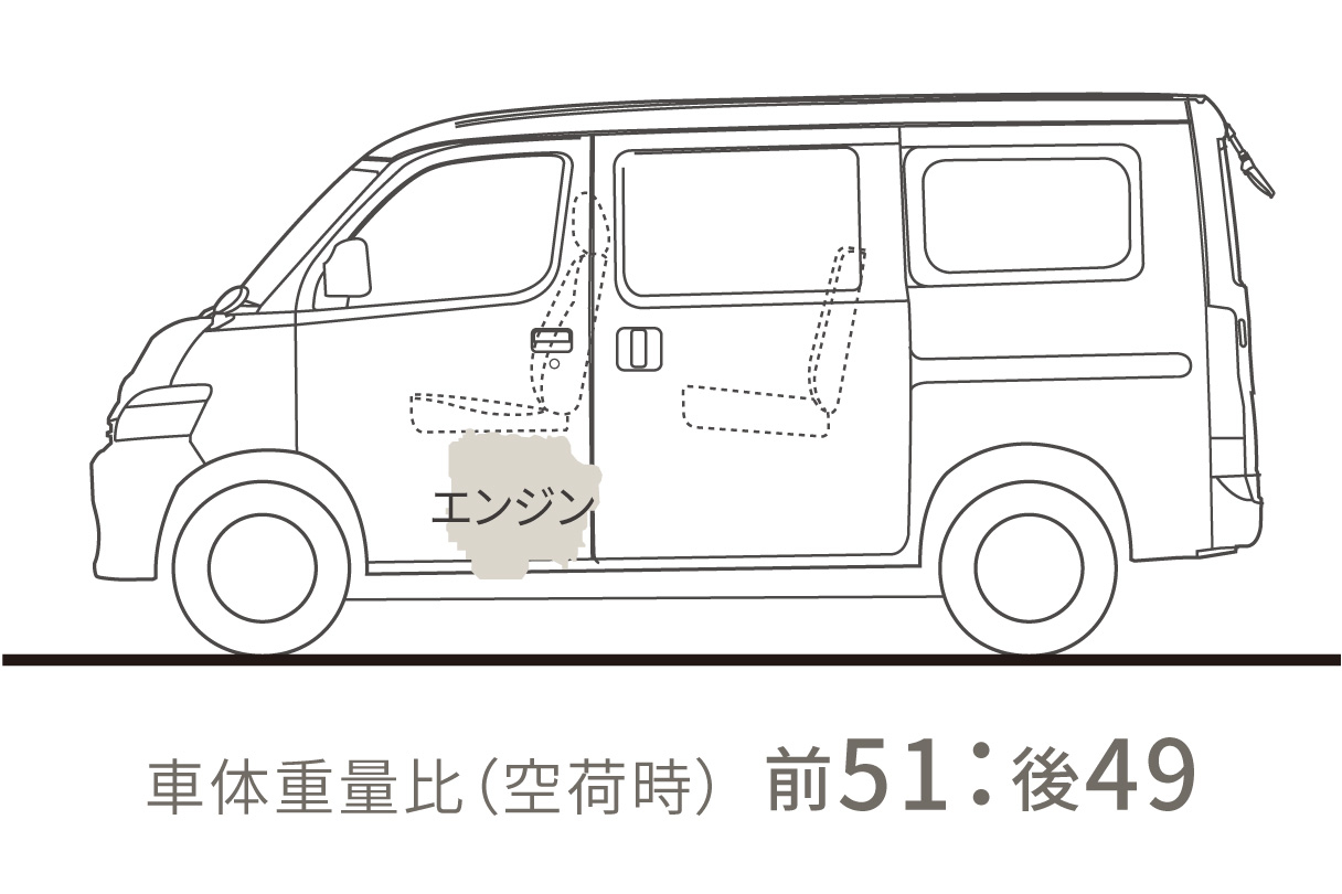 小型軽量エンジンを前席下に配置したフロントミッドシップレイアウト。4隅にタイヤを配置した理想的な前後重量配分のボディ設計により、高速域やカーブでも優れた安定性能で快適に走行できます。